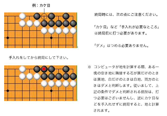 | ※ 死石を取り忘れると、アゲハマだけなくその石の周辺がダメと計算されるため、結果が大きく 違ってしま います。現在の計算結果が目算と異なる場合は、死石を取り忘れている可能性が ありますので、[戻る]をクリックして盤面をよく確認してください。 対局結果が確定すると、結果を訂正できませんので十分ご注意ください。 | |