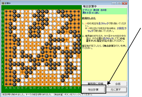 ○ 地合計算![]() | 交互に3回パスが続くと、地合計算モードになります。 地合計算モードになると、コンピュータが活き死にを判定し、次のように表示されます。