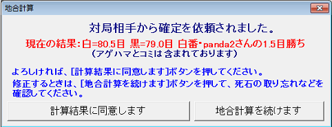 対局相手が先に[地合計算]ボタンをクリックした場合、左図の画面が表示されます。現在の計算結果を確認し、[計算結果に同意します]をクリックします。間違っている場合は、[元の画面に戻ります]ボタンをクリックしてください。 |